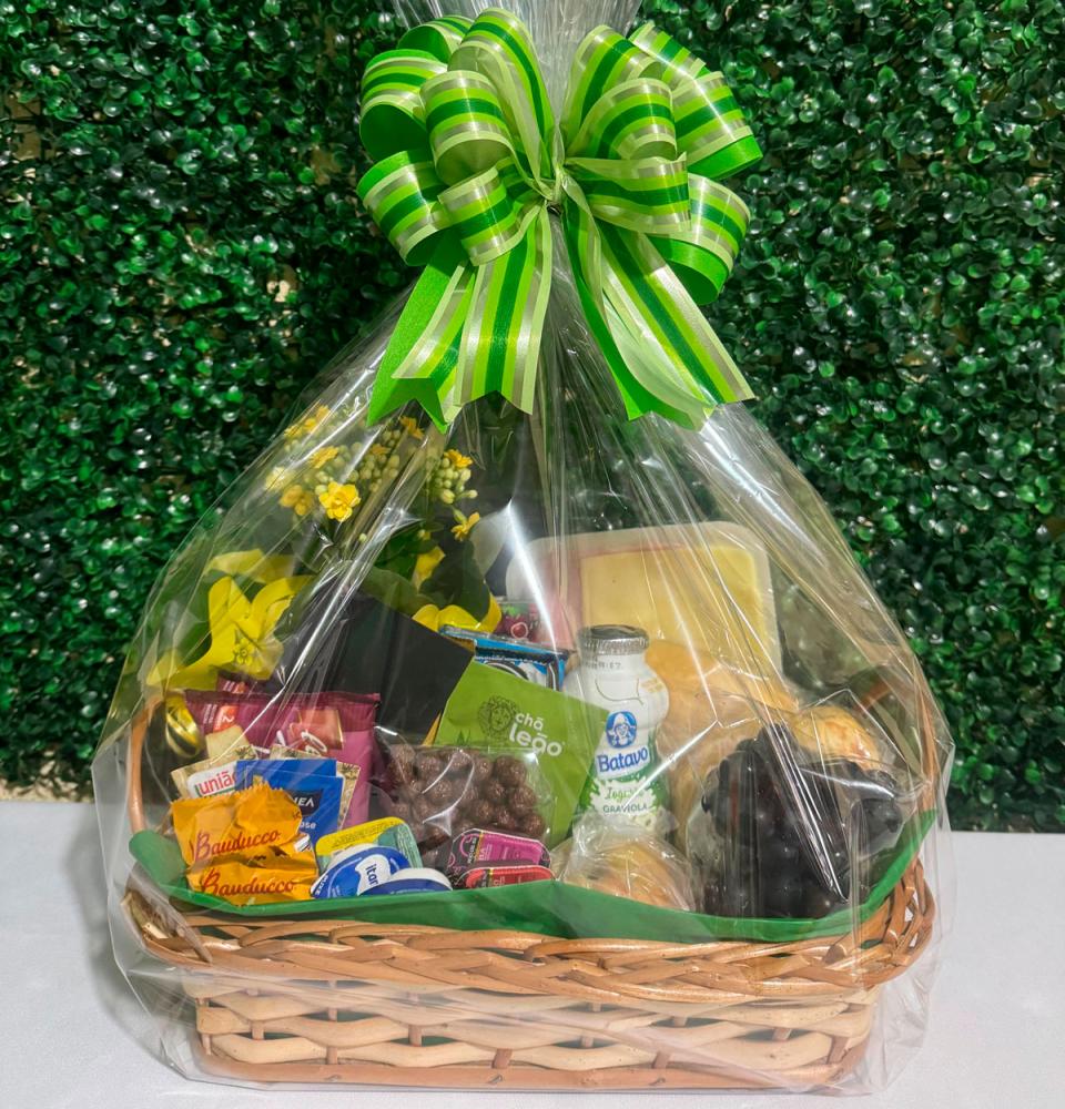*A cesta será embrulhada em papel celofane transparente e arrematada com um laço.